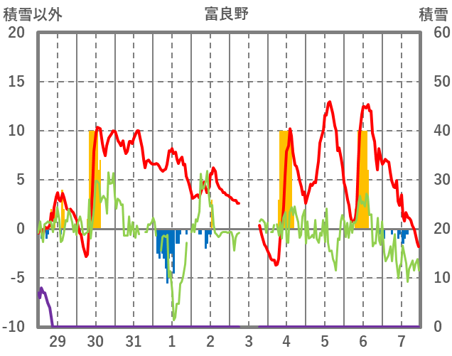 | 日 | 時 | 気温 | 降水 | 風向/風速 | 日照 | 積雪 | 降雪 |