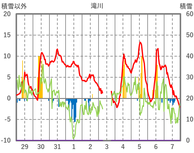 | 日 | 時 | 気温 | 降水 | 風向/風速 | 日照 | 積雪 | 降雪 |