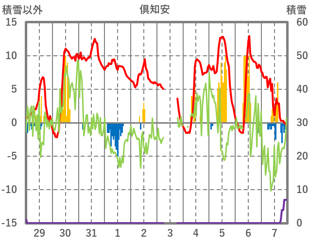 | 日 | 時 | 気温 | 降水 | 風向/風速 | 日照 | 積雪 | 降雪 |
