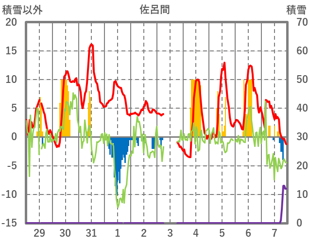 | 日 | 時 | 気温 | 降水 | 風向/風速 | 日照 | 積雪 | 降雪 |