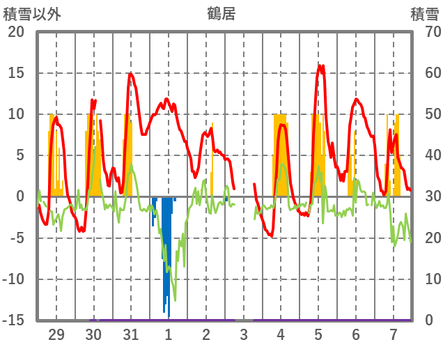 | 日 | 時 | 気温 | 降水 | 風向/風速 | 日照 | 積雪 | 降雪 |