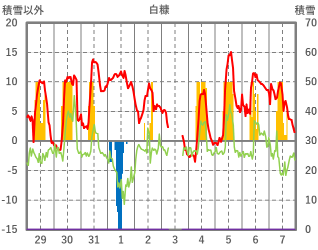 | 日 | 時 | 気温 | 降水 | 風向/風速 | 日照 | 積雪 | 降雪 |