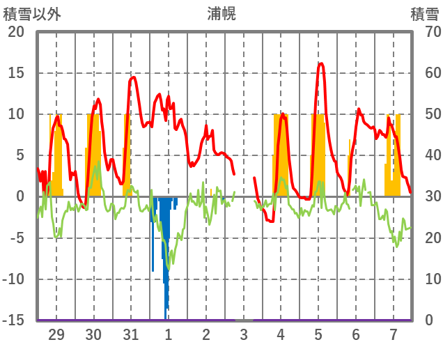| 日 | 時 | 気温 | 降水 | 風向/風速 | 日照 | 積雪 | 降雪 |