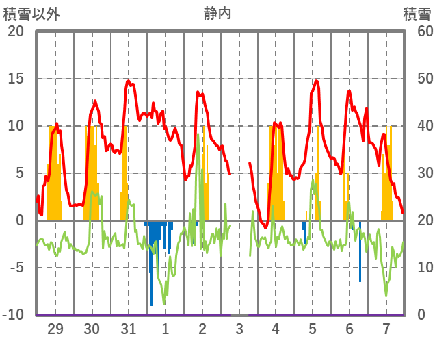 | 日 | 時 | 気温 | 降水 | 風向/風速 | 日照 | 積雪 | 降雪 |