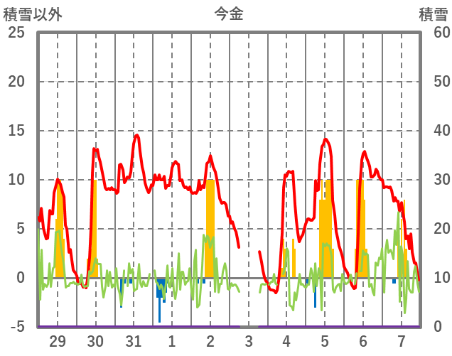 | 日 | 時 | 気温 | 降水 | 風向/風速 | 日照 | 積雪 | 降雪 |