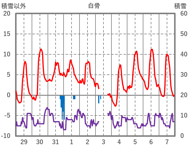 | 日 | 時 | 気温 | 降水 | 風向/風速 | 日照 | 積雪 | 降雪 |
