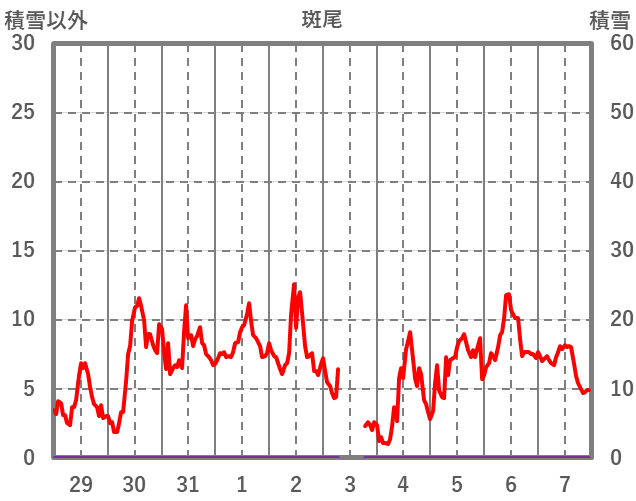 | 日 | 時 | 気温 | 降水 | 風向/風速 | 日照 | 積雪 | 降雪 |