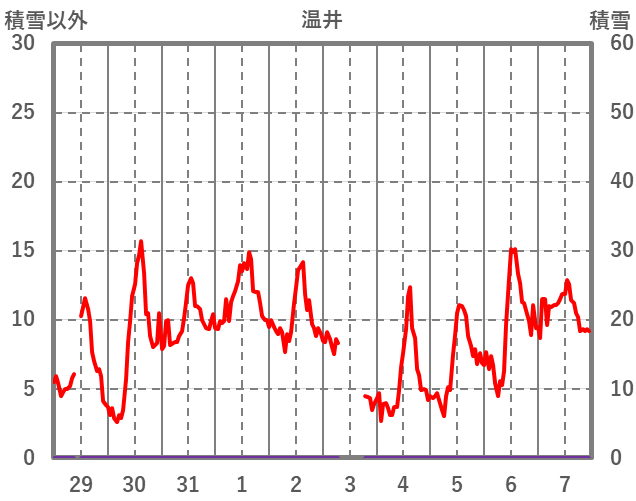 | 日 | 時 | 気温 | 降水 | 風向/風速 | 日照 | 積雪 | 降雪 |