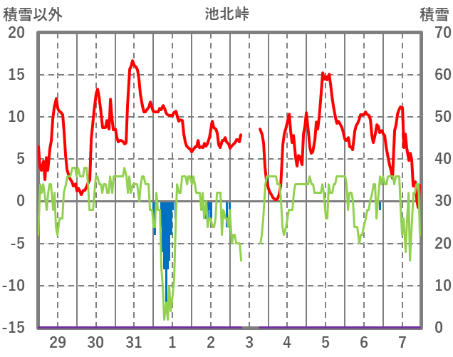 | 日 | 時 | 気温 | 降水 | 風向/風速 | 日照 | 積雪 | 降雪 |