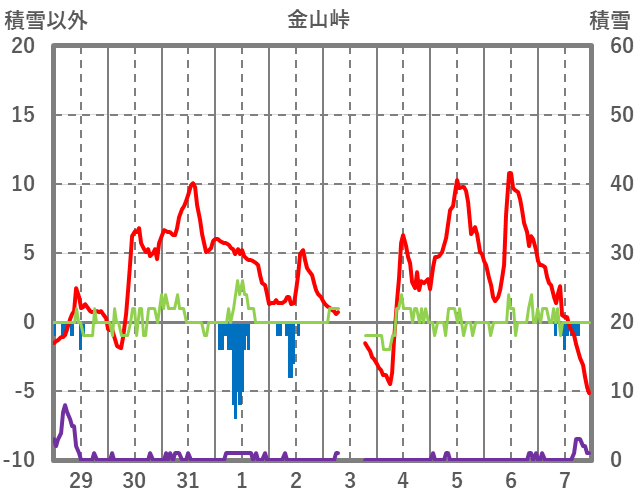 | 日 | 時 | 気温 | 降水 | 風向/風速 | 日照 | 積雪 | 降雪 |