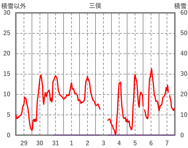 | 日 | 時 | 気温 | 降水 | 風向/風速 | 日照 | 積雪 | 降雪 |