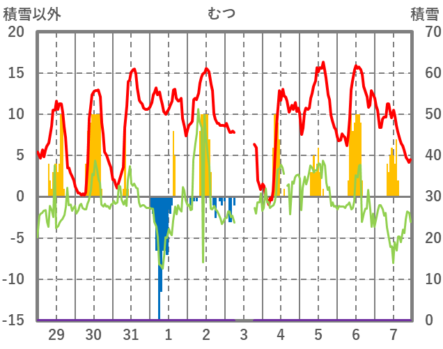 | 日 | 時 | 気温 | 降水 | 風向/風速 | 日照 | 積雪 | 降雪 |