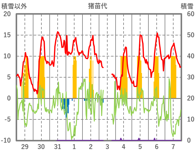 | 日 | 時 | 気温 | 降水 | 風向/風速 | 日照 | 積雪 | 降雪 |