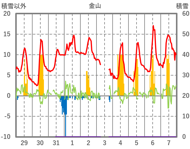 | 日 | 時 | 気温 | 降水 | 風向/風速 | 日照 | 積雪 | 降雪 |