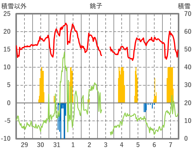 | 日 | 時 | 気温 | 降水 | 風向/風速 | 日照 | 積雪 | 降雪 |