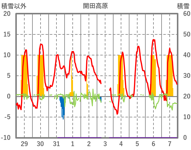 | 日 | 時 | 気温 | 降水 | 風向/風速 | 日照 | 積雪 | 降雪 |