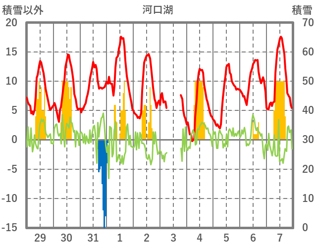 | 日 | 時 | 気温 | 降水 | 風向/風速 | 日照 | 積雪 | 降雪 |