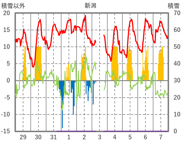 | 日 | 時 | 気温 | 降水 | 風向/風速 | 日照 | 積雪 | 降雪 |