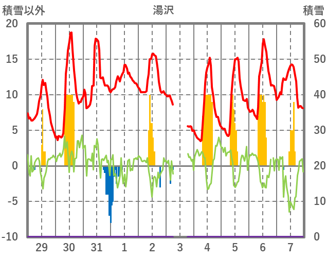 | 日 | 時 | 気温 | 降水 | 風向/風速 | 日照 | 積雪 | 降雪 |