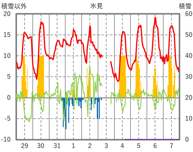 | 日 | 時 | 気温 | 降水 | 風向/風速 | 日照 | 積雪 | 降雪 |