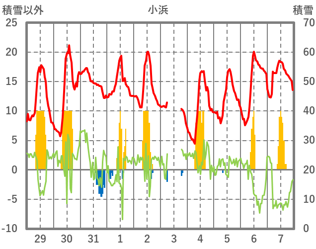 | 日 | 時 | 気温 | 降水 | 風向/風速 | 日照 | 積雪 | 降雪 |