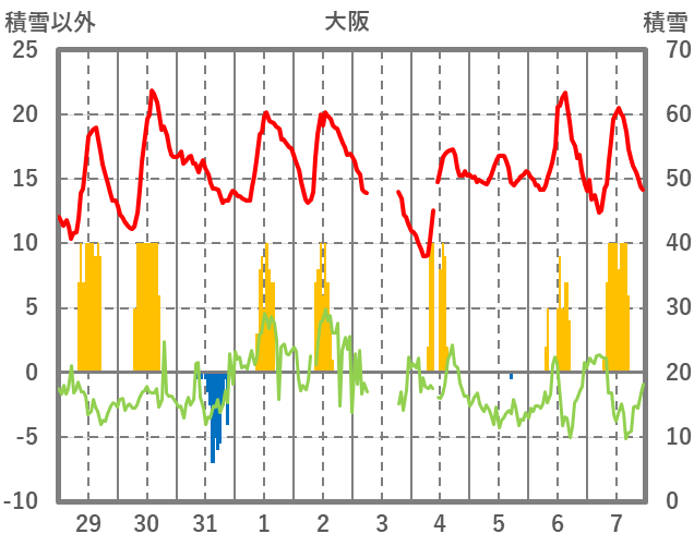 | 日 | 時 | 気温 | 降水 | 風向/風速 | 日照 | 積雪 | 降雪 |