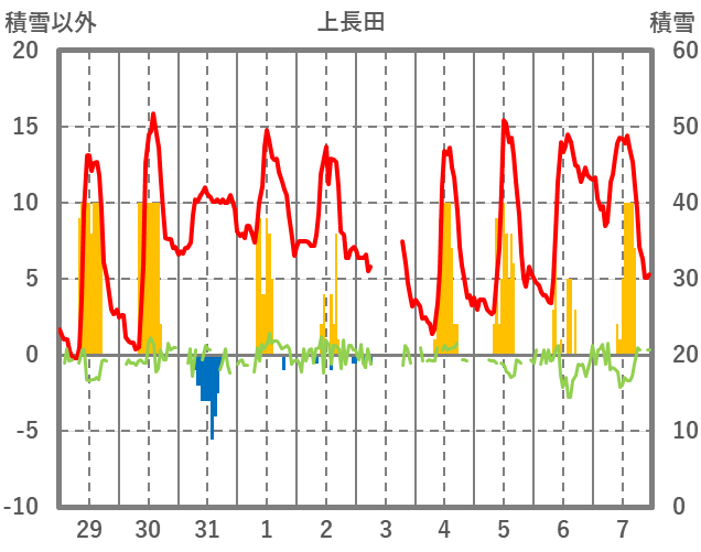 | 日 | 時 | 気温 | 降水 | 風向/風速 | 日照 | 積雪 | 降雪 |