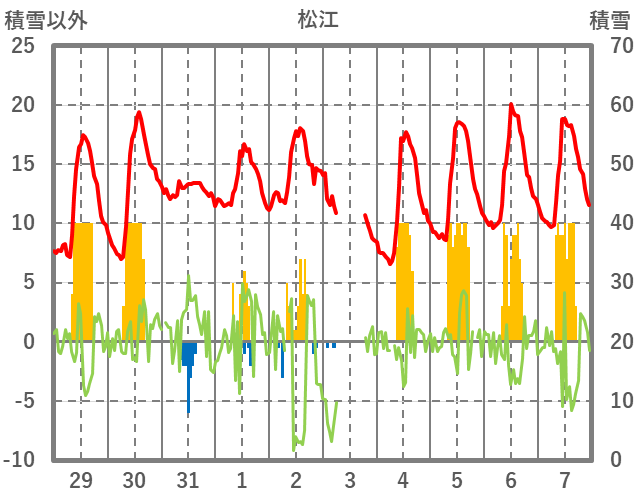 | 日 | 時 | 気温 | 降水 | 風向/風速 | 日照 | 積雪 | 降雪 |