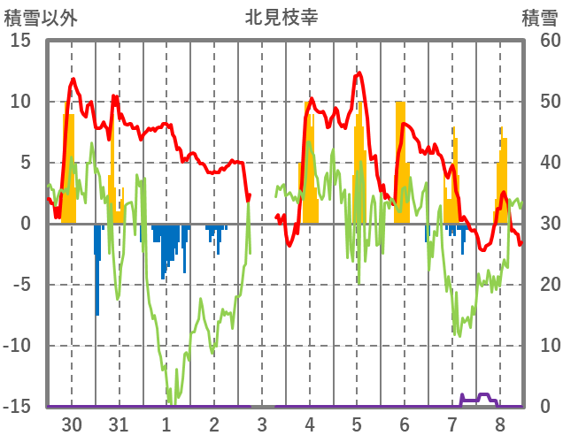| 日 | 時 | 気温 | 降水 | 風向/風速 | 日照 | 積雪 | 降雪 |