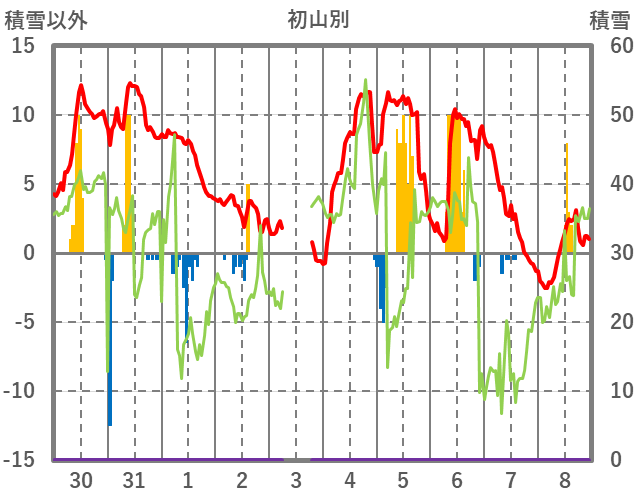 | 日 | 時 | 気温 | 降水 | 風向/風速 | 日照 | 積雪 | 降雪 |