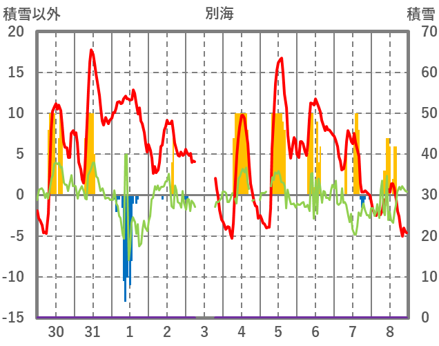 | 日 | 時 | 気温 | 降水 | 風向/風速 | 日照 | 積雪 | 降雪 |