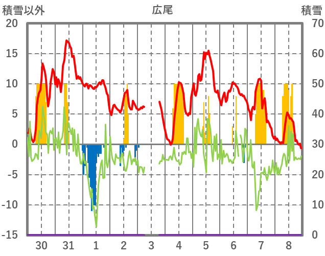 | 日 | 時 | 気温 | 降水 | 風向/風速 | 日照 | 積雪 | 降雪 |