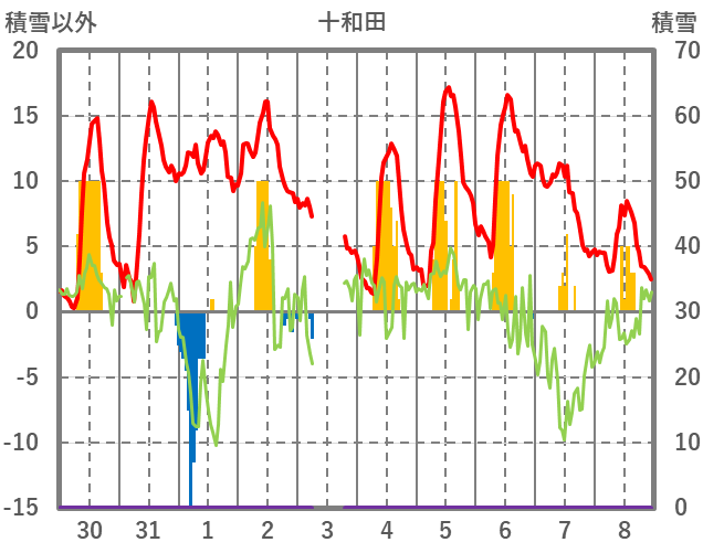 | 日 | 時 | 気温 | 降水 | 風向/風速 | 日照 | 積雪 | 降雪 |