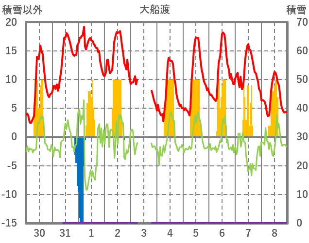 | 日 | 時 | 気温 | 降水 | 風向/風速 | 日照 | 積雪 | 降雪 |