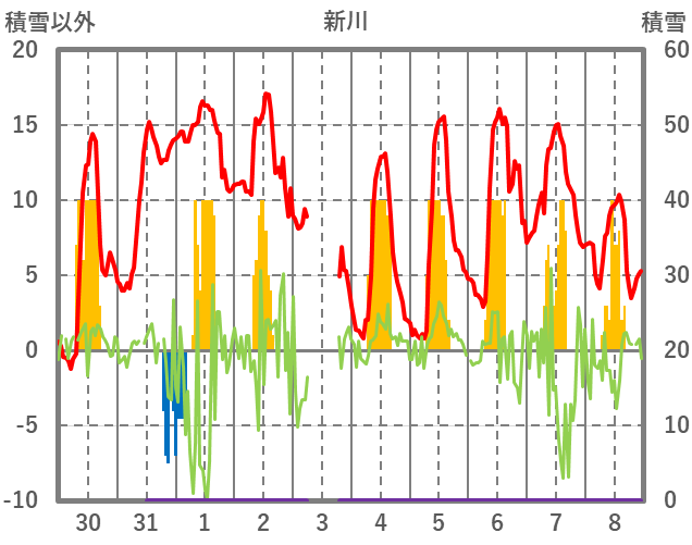 | 日 | 時 | 気温 | 降水 | 風向/風速 | 日照 | 積雪 | 降雪 |