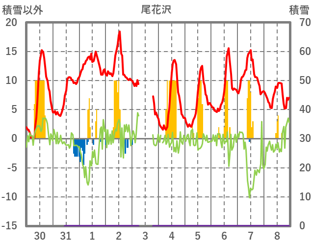 | 日 | 時 | 気温 | 降水 | 風向/風速 | 日照 | 積雪 | 降雪 |
