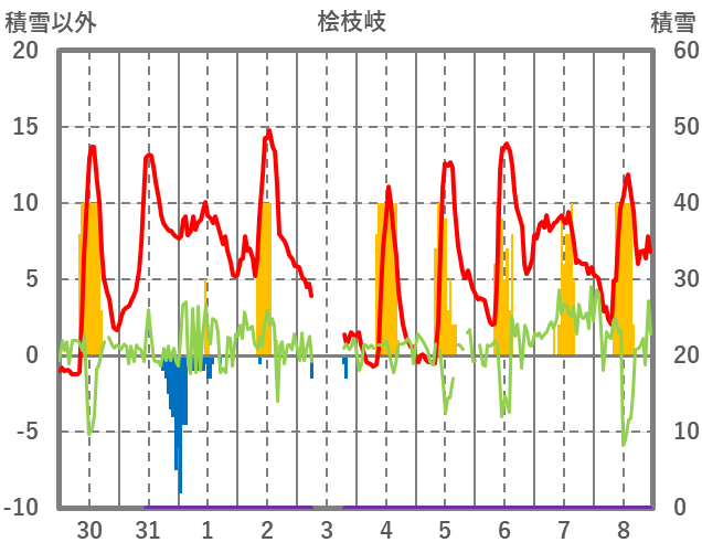 | 日 | 時 | 気温 | 降水 | 風向/風速 | 日照 | 積雪 | 降雪 |
