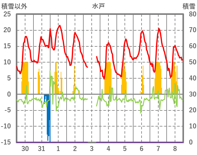 | 日 | 時 | 気温 | 降水 | 風向/風速 | 日照 | 積雪 | 降雪 |