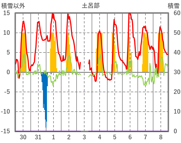 | 日 | 時 | 気温 | 降水 | 風向/風速 | 日照 | 積雪 | 降雪 |