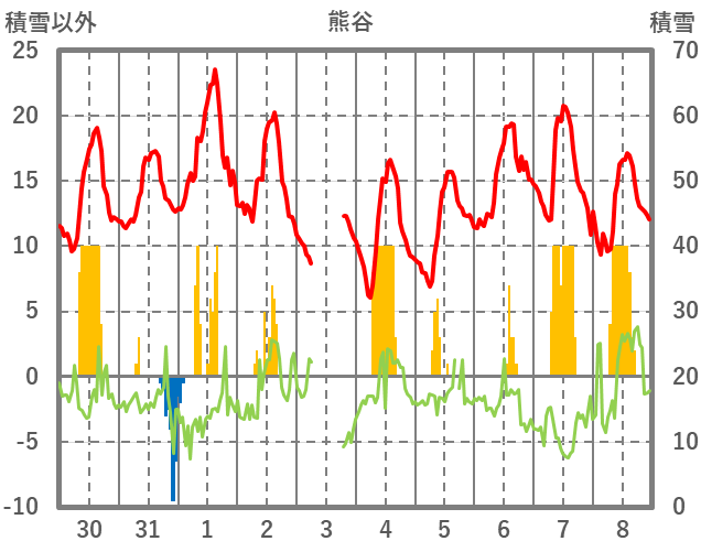 | 日 | 時 | 気温 | 降水 | 風向/風速 | 日照 | 積雪 | 降雪 |