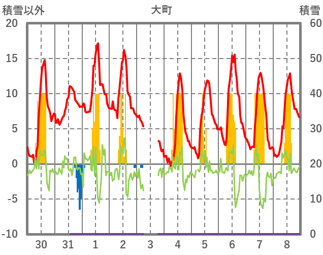 | 日 | 時 | 気温 | 降水 | 風向/風速 | 日照 | 積雪 | 降雪 |