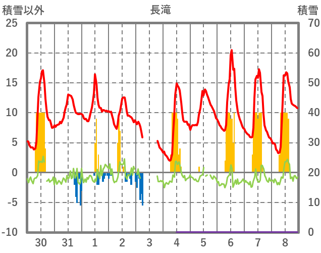 | 日 | 時 | 気温 | 降水 | 風向/風速 | 日照 | 積雪 | 降雪 |