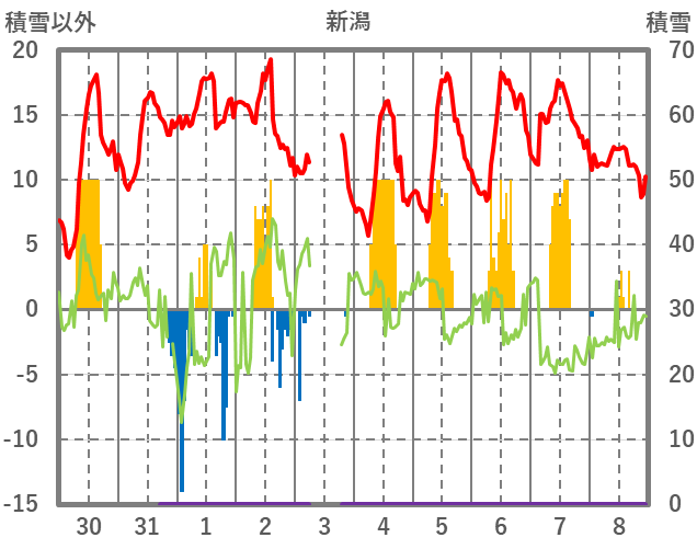 | 日 | 時 | 気温 | 降水 | 風向/風速 | 日照 | 積雪 | 降雪 |
