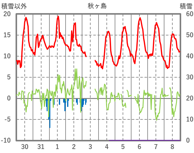 | 日 | 時 | 気温 | 降水 | 風向/風速 | 日照 | 積雪 | 降雪 |