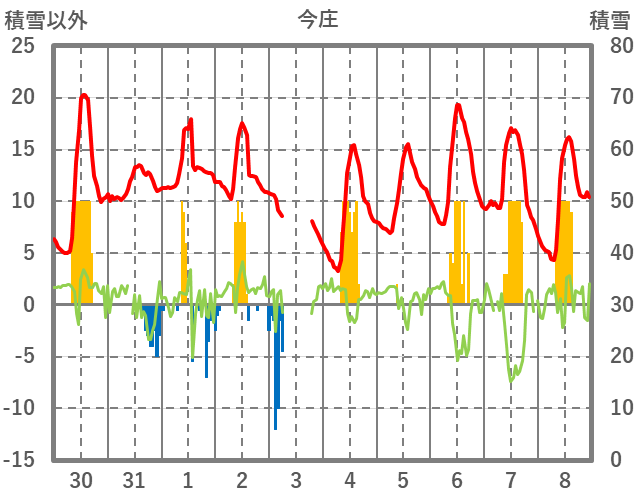 | 日 | 時 | 気温 | 降水 | 風向/風速 | 日照 | 積雪 | 降雪 |
