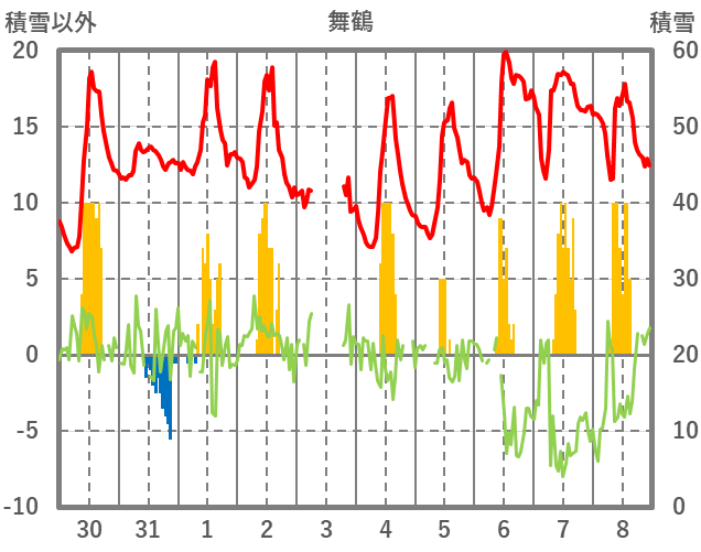| 日 | 時 | 気温 | 降水 | 風向/風速 | 日照 | 積雪 | 降雪 |