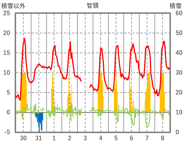 | 日 | 時 | 気温 | 降水 | 風向/風速 | 日照 | 積雪 | 降雪 |