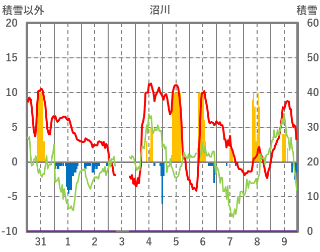 | 日 | 時 | 気温 | 降水 | 風向/風速 | 日照 | 積雪 | 降雪 |