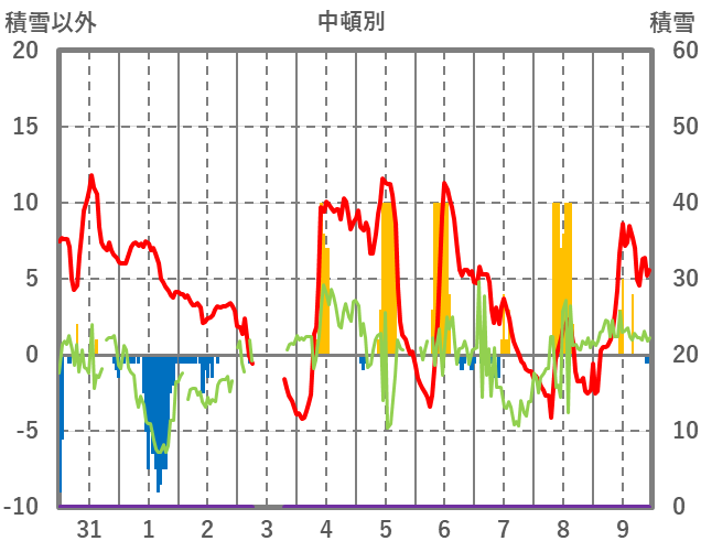 | 日 | 時 | 気温 | 降水 | 風向/風速 | 日照 | 積雪 | 降雪 |