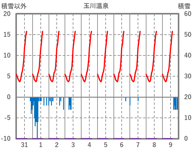 | 日 | 時 | 気温 | 降水 | 風向/風速 | 日照 | 積雪 | 降雪 |